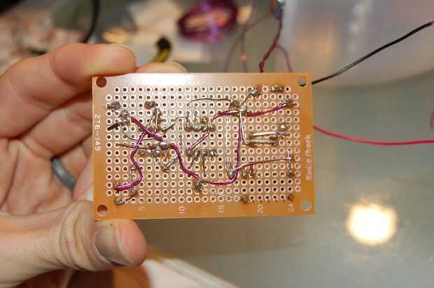 Para construir al emisor de sonido he usado un pequeño por tablero de Radio Shack que tuve en mi bandeja electrónica. Perf tableros están aún disponibles, pero probablemente no de Radio Shack. Yo no recomendaría la construcción de esta parte del circuito sin el tablero, ya que es demasiado complejo.