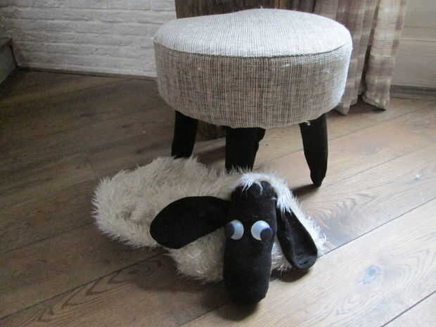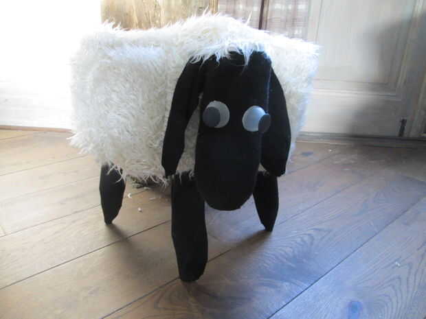 Todo es necesario es un pedazo de piel sintética, algunos calcetines y bits y sacudidas. Probablemente podría utilizar un viejo forro de abrigo y viejos calcetines. Compré medio metro de piel sintética y el más barato (sheepest)? los paquetes de calcetines que pude encontrar. Hice mío para cubrir el estrado, pero como se puede ver en la última foto se podría hacer uno acostado como una almohada.