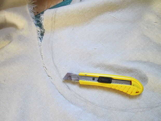 Mida su escabel y dibuja un círculo en la parte posterior de la piel falsa unos 2 cm más grande para la costura. Luego cortar un trozo rectangular de 20 cm de alto (puede variar según el tamaño de su escabel) como pasa el tejido. Usé dos piezas cosidas juntas para hacer una "bufanda" 20 cm alto y 130 cm de largo. Corte funciona mejor con un cuchillo x-acto en la parte posterior de la tela. De esta manera la piel permanece intacta alrededor de la llanta.