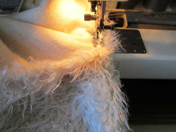 Coser el lado largo de la bufanda en el borde exterior del círculo, de lados furry en el medio. Deje una separación de 8 cm en algún lugar en el borde.