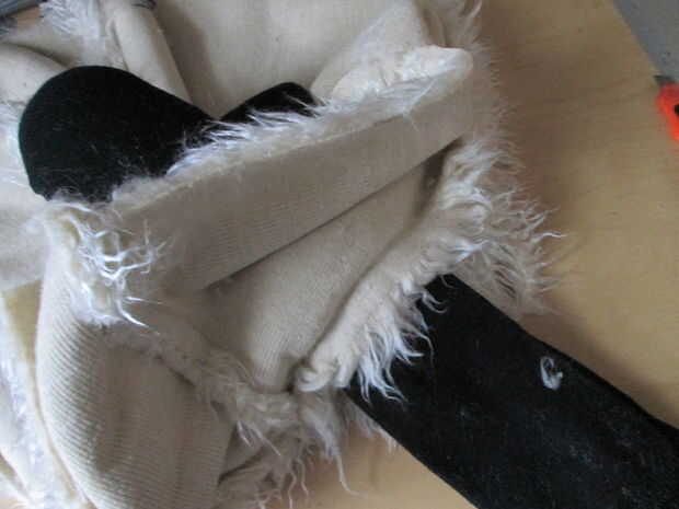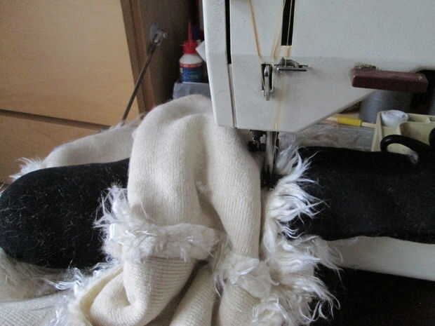Tire los calcetines de la cabeza de un oído a través de la abertura que dejaste en el borde del cuerpo. Curiosamente el resultado es mejor cuando las orejas están debajo de la cabeza. Aunque es es un gran paquete de capas podría caber debajo de la aguja de la máquina y con el más grande de la puntada disponible coser todo junto. Echa un vistazo en el ultimo paso donde he añadido un poco de piel encima de la cabeza. . Podría intentar puntada de una sola vez en este paso.