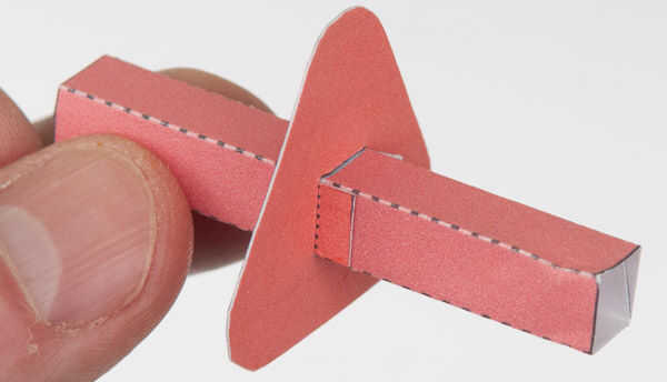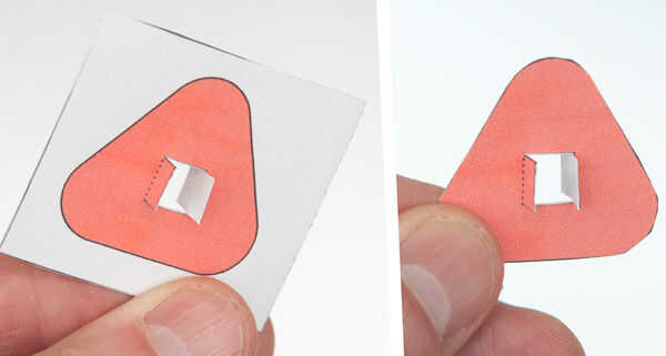 Hacer la leva triangular doblando sobre la pieza de tarjeta en tarjeta de doble grosor, una vez que el pegamento esté seco, recortar con cuidado.