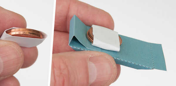 Usted necesitará dos moneditas como pesos. UK un peniques son el tamaño perfecto. (20mm de diámetro 4 gramos de peso) US$ centavo y céntimo de Euro también son un buen ajuste. Envuelva una tira de tarjeta de desecho alrededor de las monedas y el pegamento que cierre. El paquete de monedas en la parte superior del seguidor de leva del pegamento.