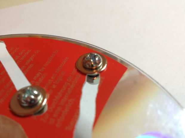Paso 9: Coloque los tornillos, arandelas y tuercas a través de las ranuras. Las tuercas deben al frente (lado brillante) del CD.