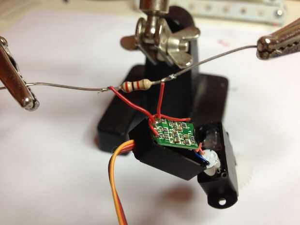 Paso 4: Ya que sólo necesitamos la rueda a girar en una dirección, sólo puede Solde un resistor de k (aprox) 2 entre los dos cables que se indica en la foto. Tuve que experimentar un poco para averiguar que dos alambres necesitan estar conectados para dar una rotación a la derecha.