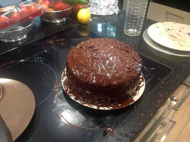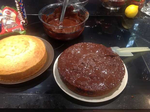 Salir de sus tortas y la guinda. El glaseado debe ser frío ya. Salir de su espátula y empezar a guinda! Primero nos va ser glaseado la parte superior de la torta de primera, para que al cortar la torta y sacar una tajada, habrá chocolate en el centro. Después de eso, fijar la segunda torta en la parte superior. Vaya todos todo el pastel.