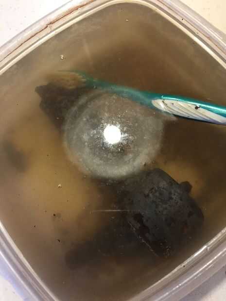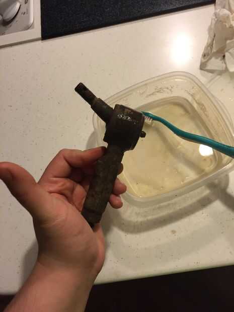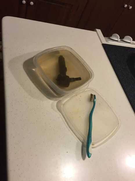 Después de que alrededor de una parte importante del día, cuando finalmente conseguí casa puse un viejo recipiente de Tupperware y vierte vinagre blanco sobre la parte superior. Yo dejarlo reposar una noche, lavados cuando pasamos al día siguiente y déjelo remojar otra vez. Este es un espacio de tiempo más largo pero no tengo el tiempo para sentarse y cepíllelo.