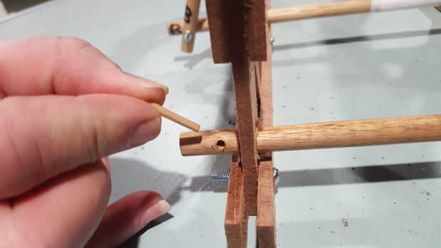 Empuje a través de los orificios en el extremo de la sección e Inserte el pasador en el extremo que falta uno. El otro extremo también puede ser falta un perno así que inserte uno allí también si es necesario.
