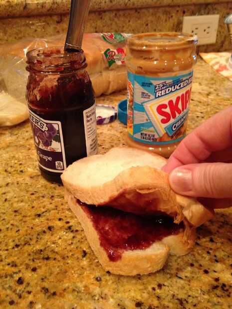 Armar el sándwich. Mantequilla de maní y jalea uno frente al otro.