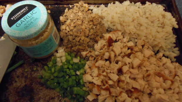 Mientras dejas que el fresco de pollo su sus castañas y setas han sido dados del tamaño de guisantes pequeños y picar la cebolla verde.