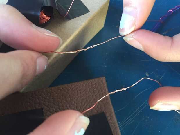 Tome el 10" extremo del cable de la bobina y Envuélvala alrededor de la diadema. Una vez que haya terminado, gire el extremo de modo que uno de los 5" piezas (en la bobina de voz).