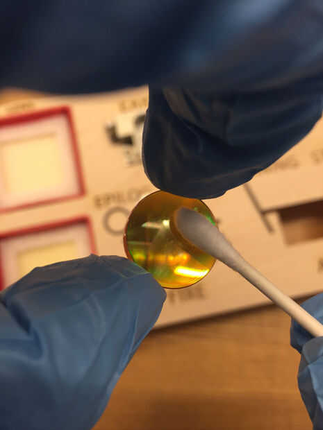 4. Añadir una gota de lente limpiador a la superficie de la lente. Usar limpiamos q-tips para limpiar la superficie de la lente. Allí se puede existir rasguños o abolladuras, pero debe haber evidencia de residuos de la lente líquido una vez limpia de la limpieza.