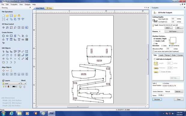 Nota sobre la creación de pestañas: Son piezas de su material que no corte para sostener las piezas en su lugar. Ya que tuve un buen montón de piezas a cortar y no quiero hacer un montón de trabajo post-procesamiento decidí no hacer fichas. Si usted tiene una mesa de trabajo con vacío entonces esto es grande porque no necesita las lengüetas de todos modos.