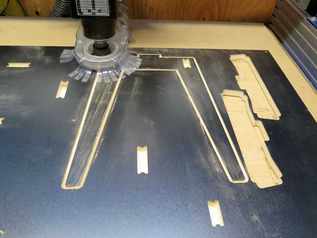 Esta es la parte fácil y divertida. Siéntese al lado del router y ver cómo la máquina corta todas sus piezas. Ya que yo estaba usando un 1/4 pulgada fresa hará 3 pasos antes de que realmente corta suelta cada parte. Comenzará haciendo los bolsillos y después corte el perfil.