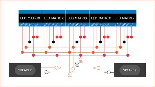 Cada módulo de la pantalla tiene un puente dirección binaria de 5 bits en la parte posterior. Cada muestra debe tener una dirección única. El escudo PWM tiene una peculiaridad I2C conflicto que entra en conflicto con la muestra, por lo que necesitan para incrementar a partir de las cinco por uno (0x71 para 0 x 75), que puede leer más acerca de la página de la visualización vinculada en el anterior paso de piezas. Los pines VCC y VI2C son todos atados a 5V. Las líneas de datos, reloj y tierra cada uno conectadas juntos en su propio bus, por lo que en última instancia se extienden sólo cuatro alambres de la pantalla. Los módulos de exhibición de pop en la parte trasera de la placa del marcador y se sujetan con unas gotas de pegamento caliente.