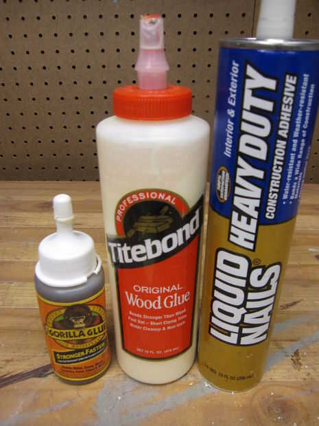 - Pegamentos: Pegamento de carpintero (de Elmer, etc.), el adhesivo de construcción (Liquid Nails, etc.), pegamento del poliuretano (pegamento del gorila, etc..)