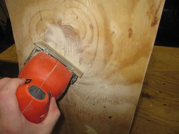 Rellena todos los agujeros de clavo/tornillo y otras imperfecciones con woodfiller. Luego lije toda la cosa.