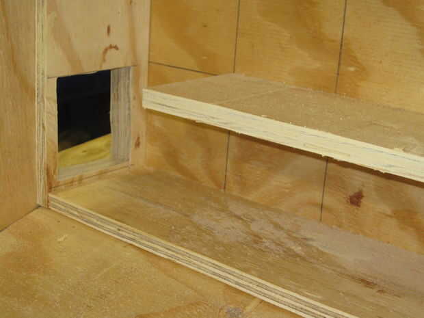 Corte los dos lados de la caja de madera contrachapada. Utilizando el patrón, traza la colocación de la caja de laberinto en cada lado del gabinete. Utilizar dos trozos pequeños de madera para crear una cuña que puede utilizarse para mantener la caja laberinto en lugar mientras que fijarlo. Tornillo de los lados de la caja a la caja de laberinto.