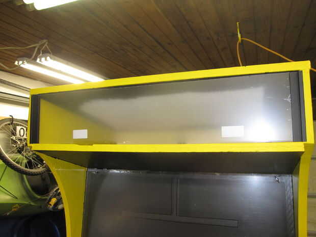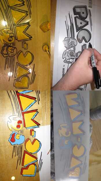 Para crear el gráfico de la marquesina, a pintar el interior del plexiglás para que la parte frontal tiene un acabado liso, pulido. Para hacer esto usted necesitará pintar "hacia atrás". Lo que quiero decir es, que te pinte el contorno primero su forma de trabajo en los otros colores y acabado con el color de fondo. Para crear el gráfico, imprimir el recuadro de Pac Man desde una computadora y trazar el contorno sobre el plexiglás con un Sharpee.