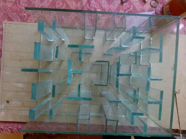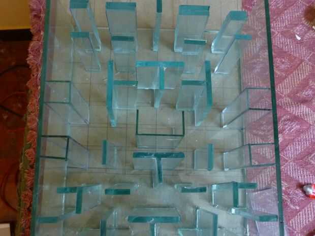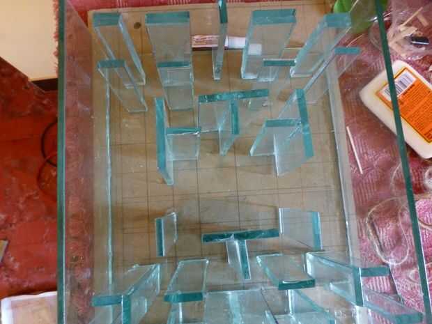 Podemos empezar a construir el laberinto de la parte inferior. Aquí he utilizado las líneas guía como referencia y encolar las piezas de vidrio para formar el laberinto.