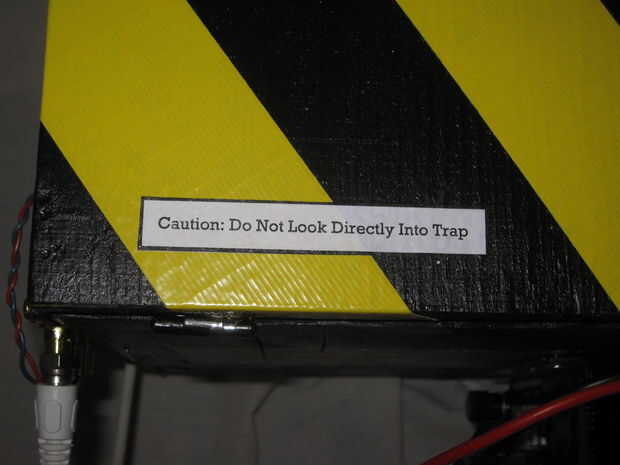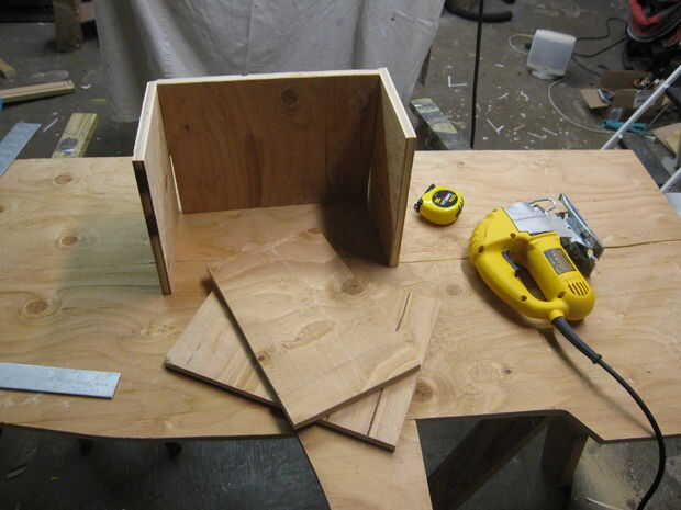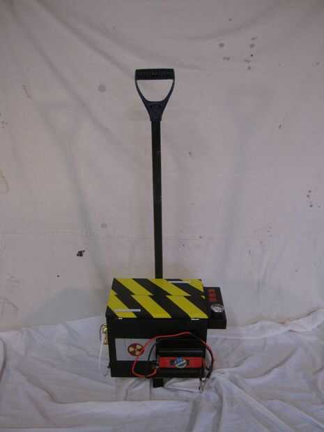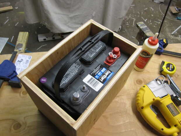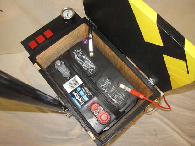 Pero esta configuración se ve terrible. Y se corre el riesgo de algunos s ** t cabeza kid poco agarrando los terminales en el día de la carrera. Además, la batería contiene plomo y ácido líquido por lo que es realmente pesado. Así que usted querrá construir una cubierta para la batería que tiene ruedas. Cortar los cuatro lados de madera contrachapada que es unas pocas pulgadas más alto que la batería (de modo que hay espacio para las conexiones). Añadir un fondo y una tapa con bisagras. Poner unas ruedas en la parte inferior así que usted puede moverse fácilmente. He añadido un asa (de una pala de nieve) por lo que pude mover fácilmente la unidad. Entonces, lo truco estilo Cazafantasmas! Los cazafantasmas y Pac-Man tienen un enemigo común. Así que por qué no crear un mashup de hipster fresco combinándolas.