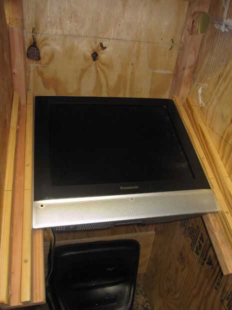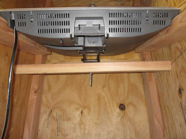 Simplemente tome nota del ángulo de la superficie de juego y soportes para TV en el coche SBD. Si utiliza un televisor de pantalla plana y tiene el soporte de la TV, eres oro. Utilice para fijar el televisor de la mudanza. El resto sólo puede apoyar la televisión en la posición correcta. He utilizado una viga travesaño y dos piezas apoyo.