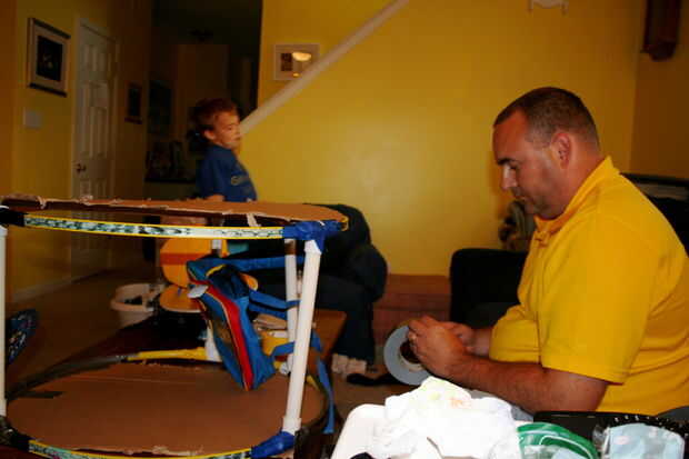 Tomamos nuestras pipas del PVC y creó 3 modela con 2 piezas en forma de t y longitud de la tubería.  Entonces nos dividimos el círculo de hula hoop y deslice forma a los aros de hula para unir juntos los dos aros.  Luego envuelve cada conexión en cinta para mantenerlos en su lugar.  A continuación, tomó la mochila y colocar las tiras sobre la barra de soporte superior y tubo con cinta en su lugar.   Nos y luego cubrimos los aros de hula con el tablero de tarjeta para reforzar los lados.