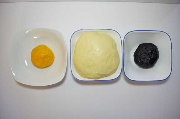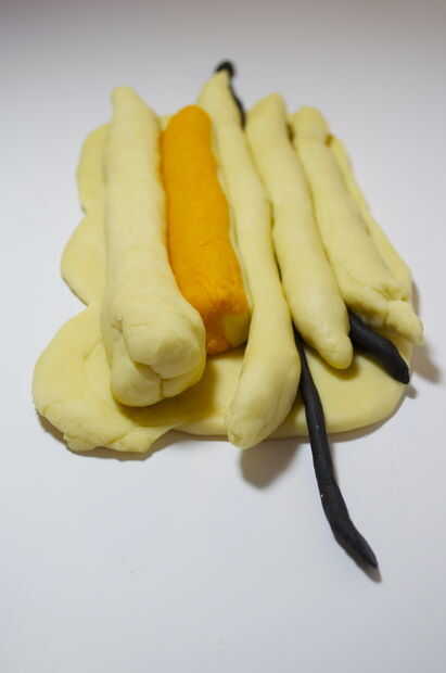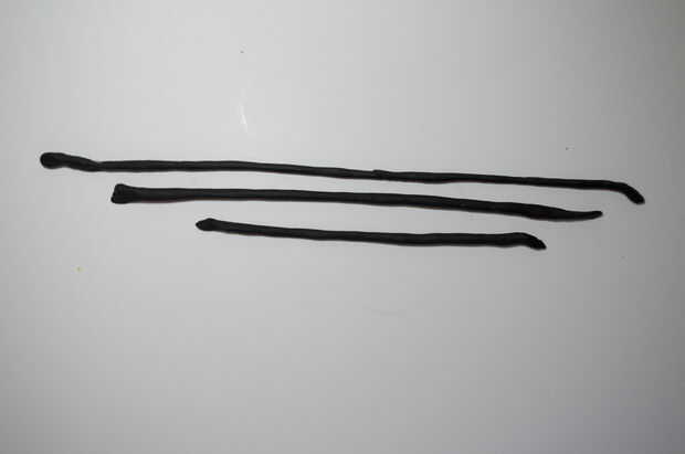 2. cortar la masa negra en dos o tres trozos y rodar en súper delgadas "serpientes". Recuerde que la masa subirá otra vez, por lo que el ancho que ves ahora es al menos la mitad de lo que será después de la cocción.