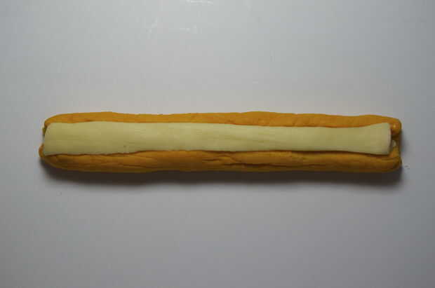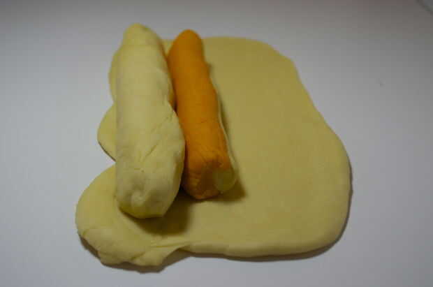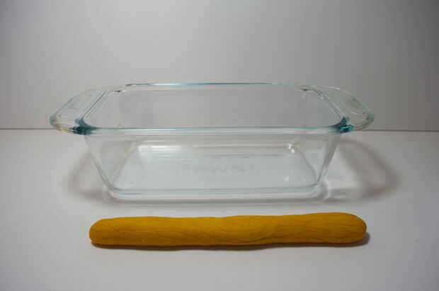 3. Extienda el color amarillo hasta que es un 2 pulgadas más largo que el molde de pan, se se corte los extremos para darle un aspecto más limpio.