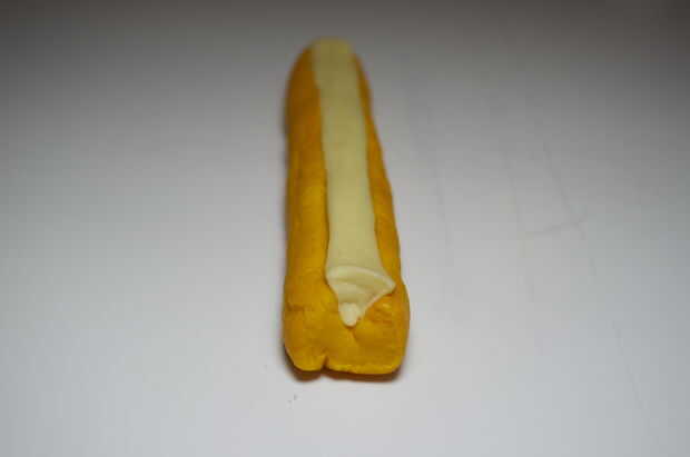 5. con el rollo de masa blanca a una serpiente a la longitud de la masa amarilla (etapas 3 y 4). Luego pellizque la parte superior de la "serpiente" y cuña esta porción en la "boca" del pac-hombre. Sonido más confuso es! Ver fotos 3 y 4 para la clarificación.