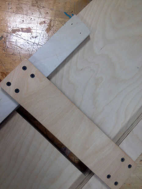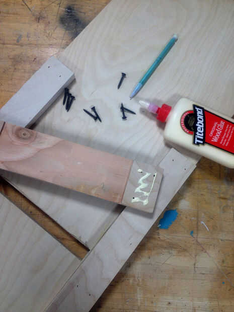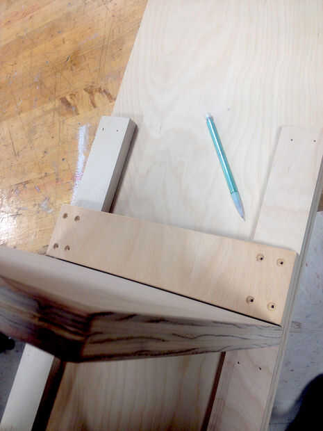 Para la siguiente parte, coloque el asiento en la parte de atrás para medir donde se coloque esta pieza cruzada. Coloque el travesaño sobre el asiento y empuje derecho contra la madera. Luego estirar un poco lejos para dar espacio para tirar asiento dentro y fuera de la ranura. Con un lápiz, marque una línea guía para alinear esta pieza cuando se agrega el pegamento. * Ver imagen 2 para ayudar en este proceso. Sólo asegúrese de que no colocarlo debajo de donde va el asiento, pero arriba. Agregue el pegamento a las áreas pequeñas en el lado cortado y alinean en la línea dibujada. Con ocho tornillos fijar esta pieza final. Con pinzas en este proceso le ayudará a asegurar que las dos piezas se aseguran con sin espacios.