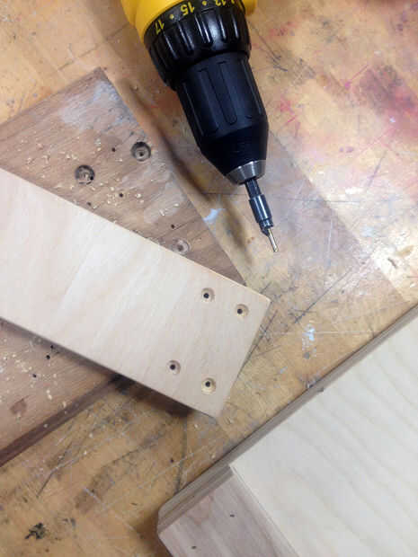 Para fijar esta pieza que debemos establecer algunos agujeros. Todo el camino a través de permitir que los tornillos sacar la pieza de madera la pieza se asegura a orificios guía. Comenzar marcando 4 puntos uno en cada esquina de la zona 3 "x 2" que quedará sujeta a las piezas del lado largo que previamente conectado a la parte posterior. Luego tomar un poco de fregadero de contador y perfore a través de los ocho puntos que acaba de hacer. Si no tienes un fregadero contrario poco, sólo tiene que utilizar una broca del mismo grosor de los hilos o núcleo del tornillo que va a utilizar (este método no permite las cabezas de los tornillos al estar al ras con la superficie de madera).