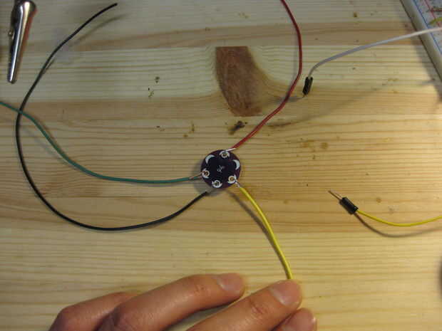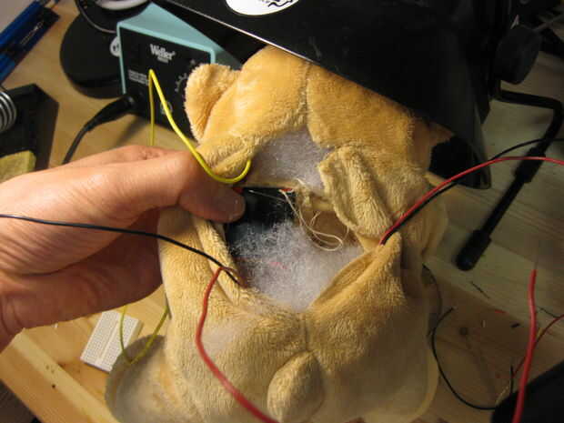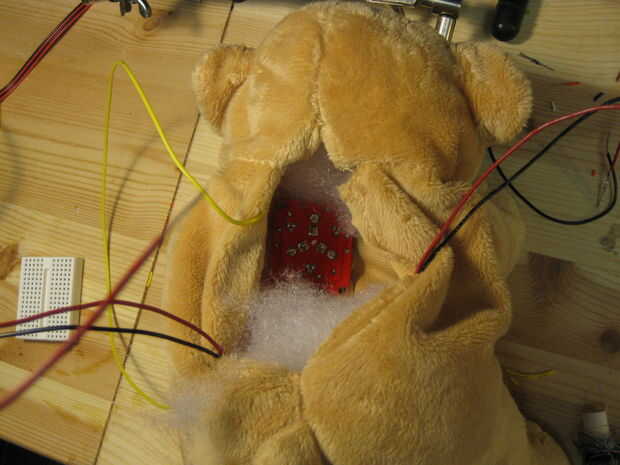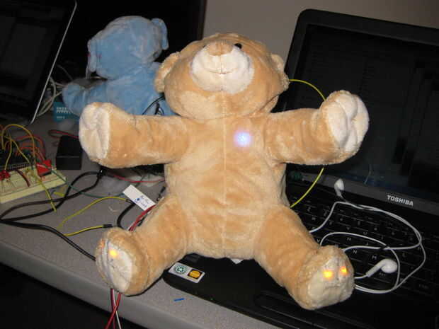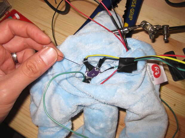 Para el corazón del oso de oro, utilizamos uno de Tri color LED Breakout Kits de Sparkfun porque eran realmente brillantes y dio un agradable y cálido resplandor.  Las indicaciones sobre como armar el Kit de arranque se pueden encontrar en este sitio.  No tienes que utilizar el kit de arranque.  Cualquier tri color LED funcionará.  Por ejemplo, utilizamos el Tri color LED de LilyPad de nuestro oso azul.  Hemos cosido la luz en el oso para evitar que se mueva.