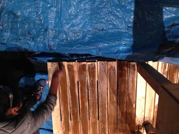 El color de la ducha es de color marrón. Para hacer que parezca viejo y húmedo, añada agua a la pintura. Pintar toda la madera.