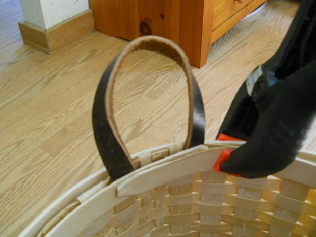 Opcional pero bonito, he añadido un aprox. 10" pieza de correa de cuero, otro hallazgo"centro de reciclaje", intercalando entre el borde interior y exterior, dos agujeros y agregar tornillos de Cleveland, sólo a la parte posterior de la canasta, donde el mango es.