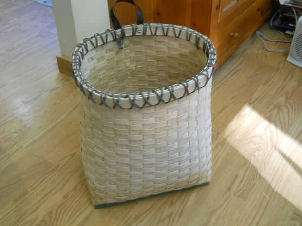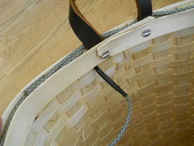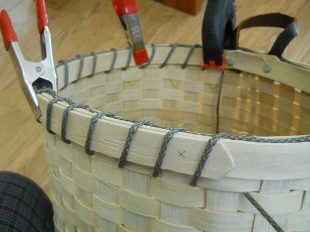 A coser el borde en su lugar, comenzar a "coser" a través de los agujeros en el tejido, en una diagonal. Tire de ella agradable y apretado todo el tiempo! Al llegar a la parte delantera de la cesta, marca, taladro y agregar un perno de Cleveland para unir el borde. (ver foto) Cuando regreses a donde empezaste el látigo de la puntada, (empecé en la manija) la vuelta y volver al revés, formas de hacer "X" en la parte superior de la cesta a medida que avanza.