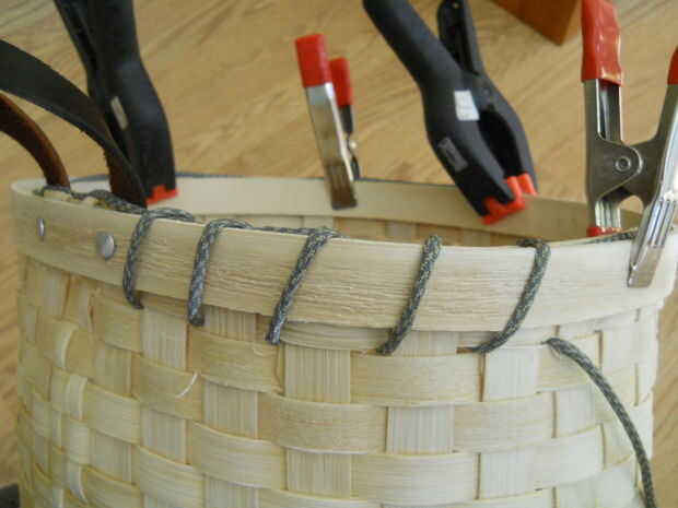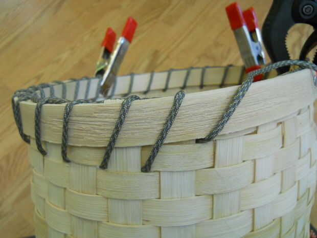 Coloque cuidadosamente un trozo de paracord, cortado a la medida, entre el borde interno y externo, quitar y reemplazar las abrazaderas como lo haces. Esto se denomina "borde relleno" y hará que la parte superior de la cesta parece mejor, ocultando el egde irregular de la parte superior de la armadura. Nota: Puede utilizar muchos artículos diferentes para el relleno de borde: hilado, pastos marinos, paracord o usted puede saltarla en conjunto si quieres.