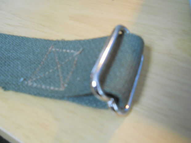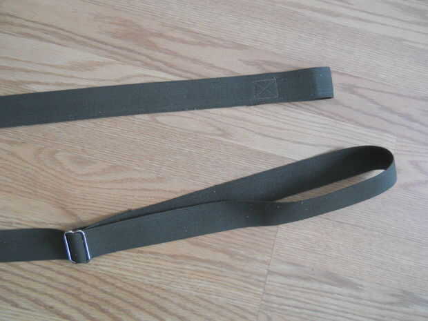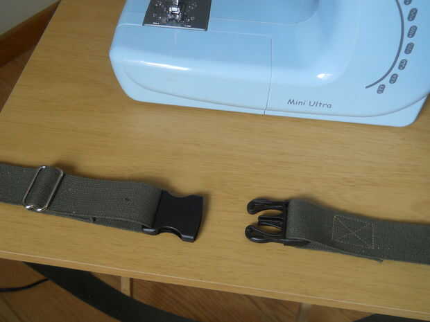 Coser un extremo de una 6' pedazo de cinta a la mitad de una botella. Hilo de rosca en uno la mitad de la hebilla, pase las correas a través de la botella, luego coser la otra mitad de la hebilla, asegurándose de que el 'superior', o cosméticamente agradable a lado de la hebilla y los dobladillos de la web están donde se supone que son.