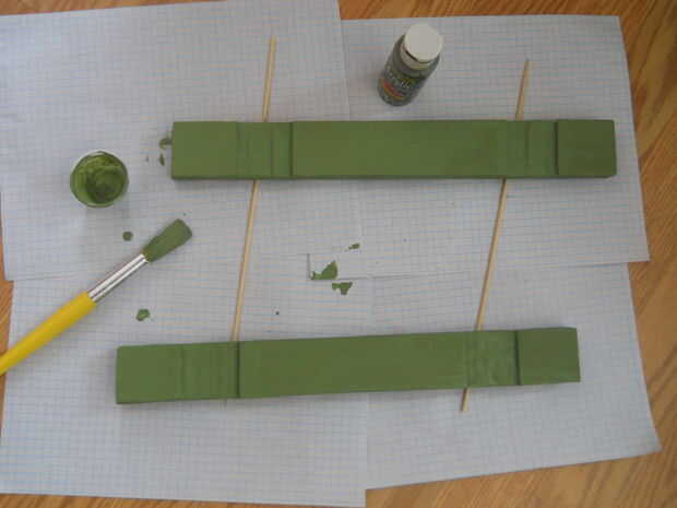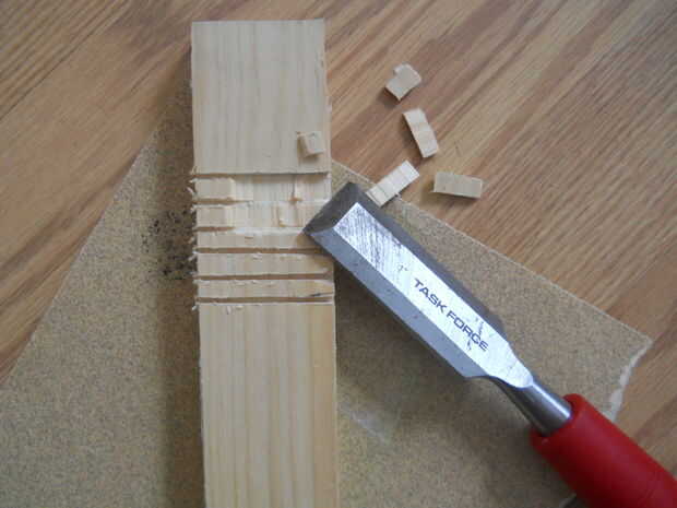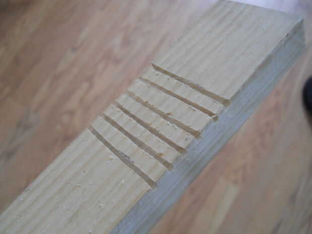 Las correas que estoy usando son de 1.5" de ancho y estoy fijando ellos 2" en de cada borde. Use una sierra pequeña, como una sierra de marquetería o conjunto una sierra circular de corte poco profundo--sólo necesita espacio suficiente para el grueso de las correas. Corte varios surcos, retirar la madera con un cincel y la arena. OPCIONAL: dos capas de pintura. Estoy usando verde para que coincida con las correas.
