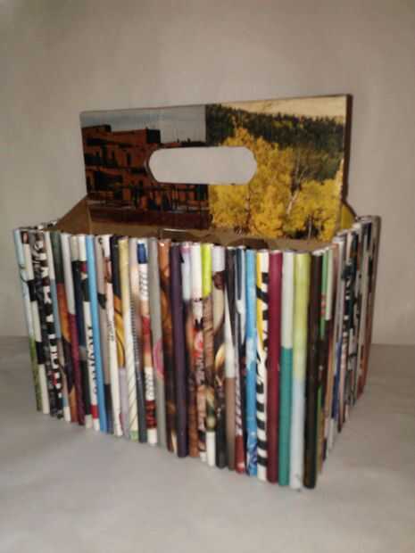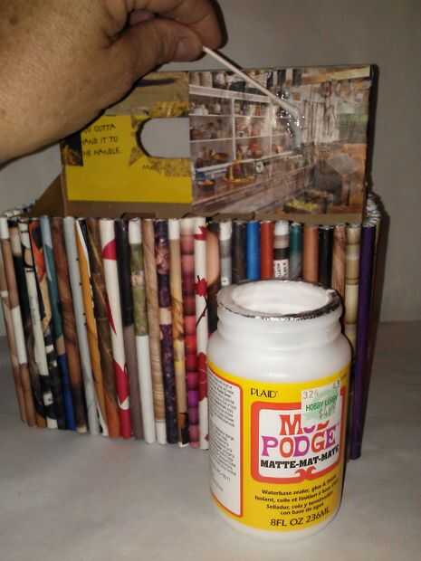 Encontrar una colorida página de la revista y usando pegamento de decopauge, cubre ambos lados de la manija del recipiente,