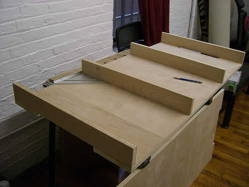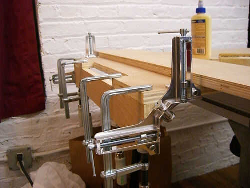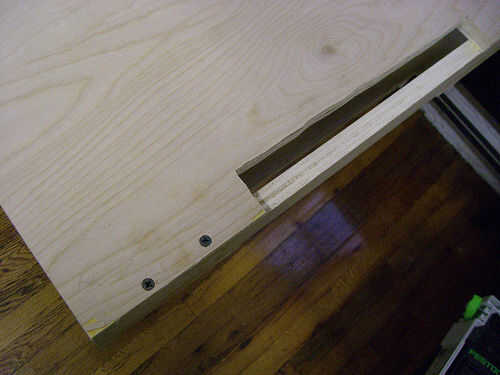 Abrazadera, pegamento y tornillos los dos fuera de separadores en la parte inferior del escritorio. Asegúrese de que queden al ras con el borde. A continuación, abrazadera y pegar las dos interiores separadores en la parte inferior del escritorio. No necesita a atornillarlas. Después de que el pegamento haya secado pinza y pegamento la parte superior de la mesa para completar el sandwich. Tornillo de la parte superior de la mesa a los separadores exterior.
