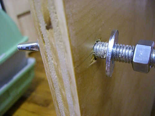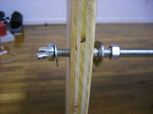 Haga dos orificios en cada pata para que la barra se puede instalar. Pongo los agujeros a medio camino entre la parte superior e inferior de la pierna y aproximadamente una pulgada en de la parte posterior.
