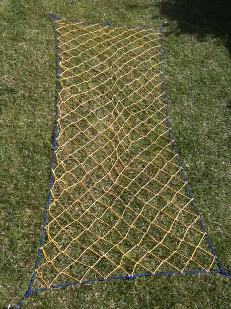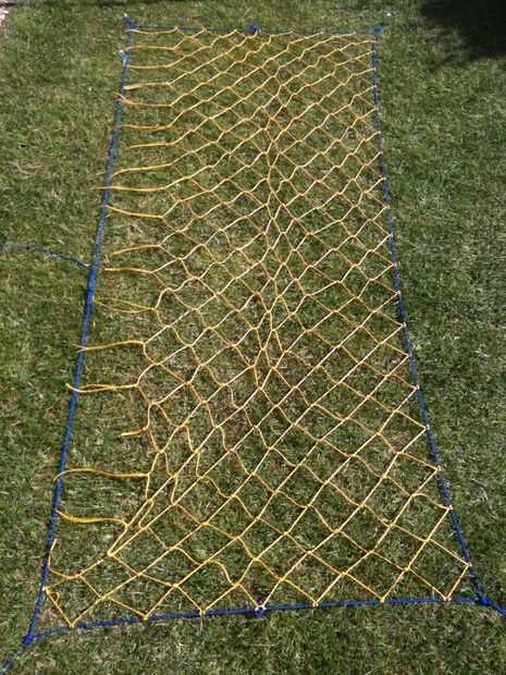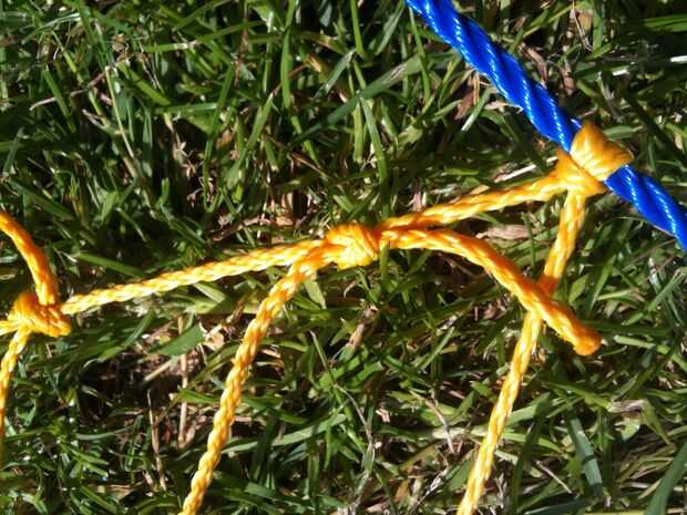 Tomar la primera cuerda y atarla al borde lateral con un pie de alondra (Foto 2), luego atar el segundo cable al final de la primera mediante un nudo de arrecife. Repetir este proceso a lo largo de la línea.
