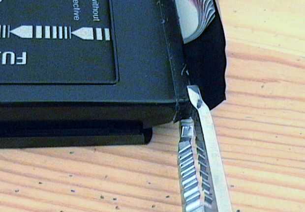 2. utilice una regla y cúter (exacto) para marcar profundamente el plástico de la película. No corte a través de todo el camino o corre el riesgo de daño a la película.