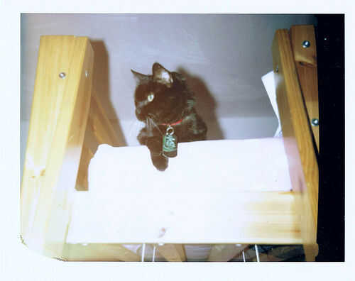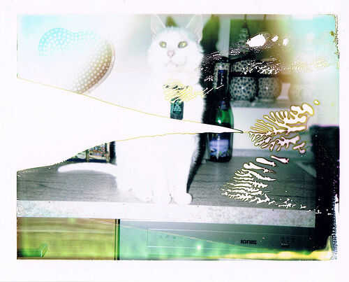 Tuve una foto jam en la cámara de 10 fotos en el pack. La foto se tomó como normal, pero la ficha de la foto no apareció en la puerta de salida de la cámara. Abrí la cámara en luz de la habitación para ver si podía de alguna manera insisto en la foto ir a través de los rodillos, pero sólo tuvo éxito en exponer la siguiente foto a la luz y lo empaña. Finalmente sacó la foto atascada y procesados manualmente con el rodillo de goma. Produjo una imagen de mi gato Eddie, pero incluye un montón de artefactos extraños. Esta mermelada ha ocurrido sólo una vez, así que voy a considerar una anomalía. Este tipo de mermelada también con poca frecuencia ocurre en las cámaras de mi pack regular, así que le atribuyo al complejo camino que estas fotos deben tener dentro de la cámara.