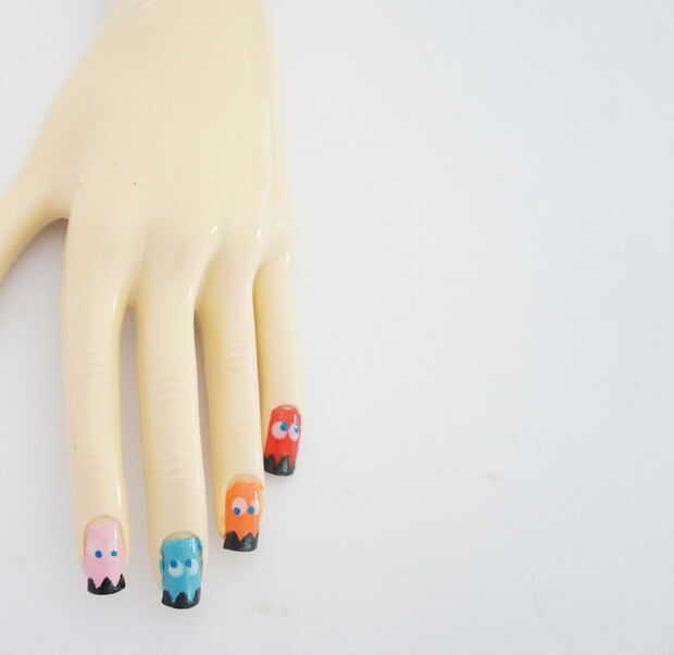 utilicé la parte trasera de un lápiz para el fondo de los ojos. Sumergir la parte posterior de la pluma en el esmalte de uñas blanco y suavemente Coloque dos puntos espaciados a cada fantasma. Para los alumnos, utiliza un