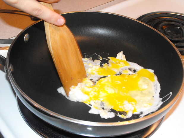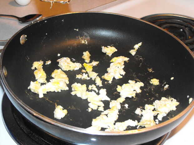 En la misma sartén, revolver el huevo (empuje y romper a trozos pequeños hasta que esté completamente cocido.) Ver la segunda foto para tener una idea de cómo romper para arriba. Asegúrese de que tener trozos pequeños para que no encontrar trozos grandes en su cojín tailandés.