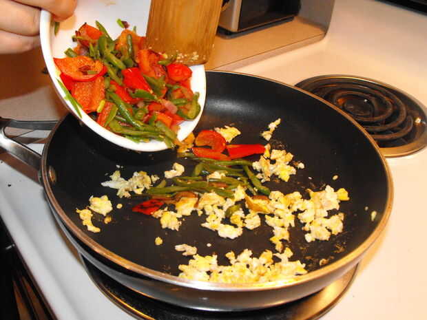 Después las judías verdes y otras verduras se doren completamente (ver tercera imagen para tener una idea de lo que debe parecer) Retire todas las verduras y coloque en un recipiente separado. Si la sartén es antiadherente (teflón), no necesita volver a engrasar la sartén. Si no es así, puede que desee utilizar algún spray antiadherente o mantequilla en él después de quitar las verduras.