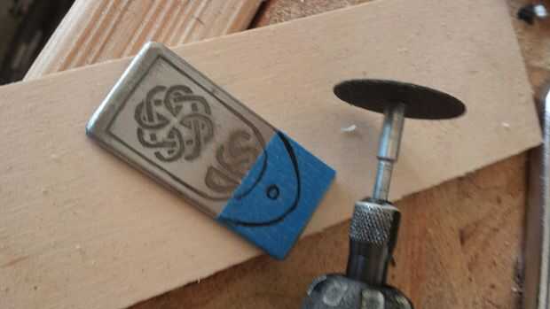 Quería que el colgante que tiene una parte superior redondeada para replicar el diseño grabado al agua fuerte. Coloqué algunos cinta de pintor en él y saqué lo que quería hasta que lo tuviera derecho. Luego salió mi dremel y cortar hacia fuera.
