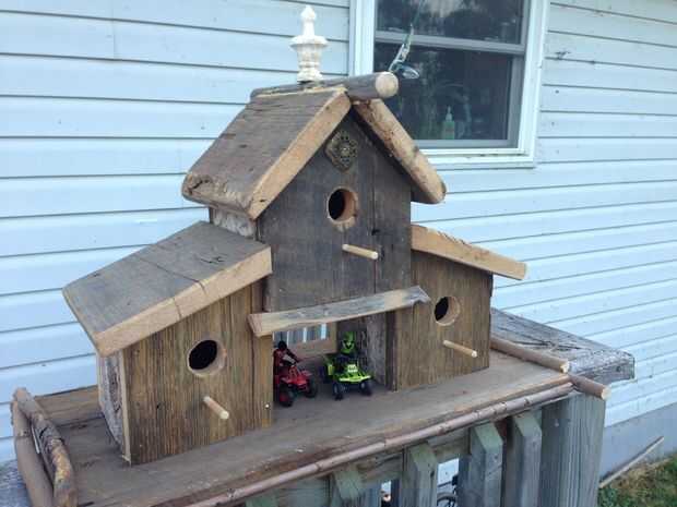 A continuación, atamos los tres nidos junto con 2" tornillos para madera que pretaladran para por el ángulo superior de los componentes de birdhouse espejo inferiores. Salimos de la azotea Plaza de tablas con bordes y corta un palo de escoba viejo para una posición superior. Las tablas del tejado visualmente fueron alineadas y pretaladradas y atornilladas a los hastiales delanteros y traseros con tornillos de 2". Llenando el pequeño espacio debajo de la percha de palo de escoba con un taco más pequeño y un montón de serrín y cola hace un pico de agua bastante apretado. La obtención final de la Cumbre de palo de escoba estaba usando dos tornillos por cada lado, bajando la percha superior apretado. Creo que mi hijo disfrutar de la parte de aserrín y pegamento como hicimos que fue apretado con ningunas grietas en cualquier parte del agua.